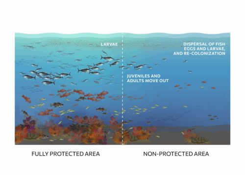 By removing human pressures like fishing from a specific area, MPAs generate more, and bigger, fish that produce more, healthier babies (see “Benefits for Nature”). The rapid population growth and recovery within an MPA’s boundaries then lead to a “spillover effect,” where larger and more abundant fish and their babies move from within the protected area to nearby areas, replenishing fish abundance and boosting fishers’ catch outside the MPA (Figure 10).