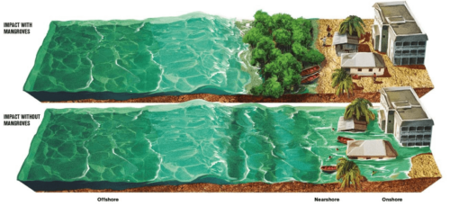- Shielding against storms and flooding: Mangroves, wetlands, and coral reefs provide protection from storm surges by serving as natural barriers for the coast. They reduce the height of the waves passing through vegetation and coral structures, and slow down wind and water before it reaches the shore (Figure 13).